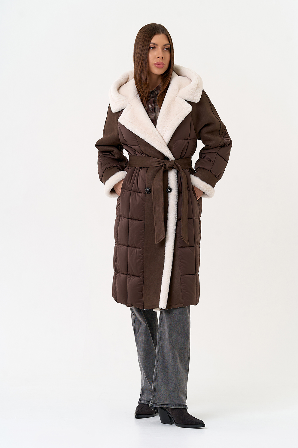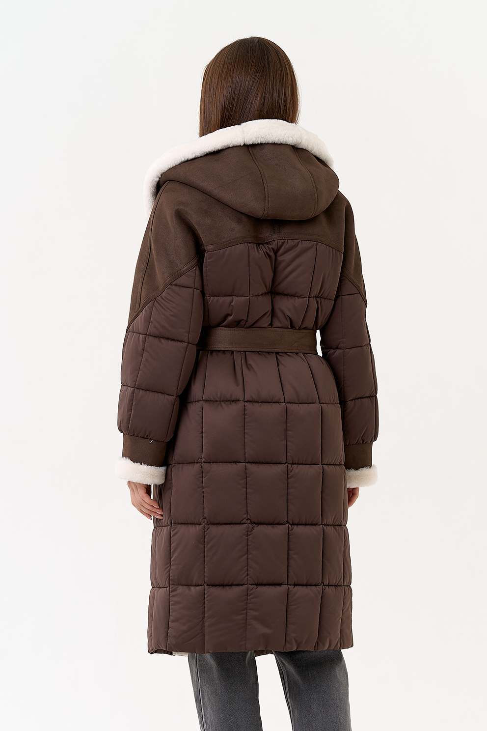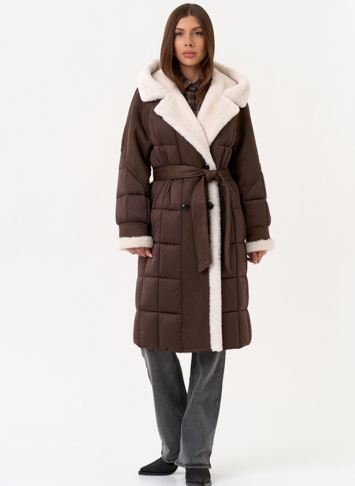 Крой воротника - капюшон, отделка эко мех